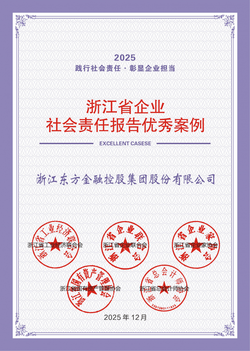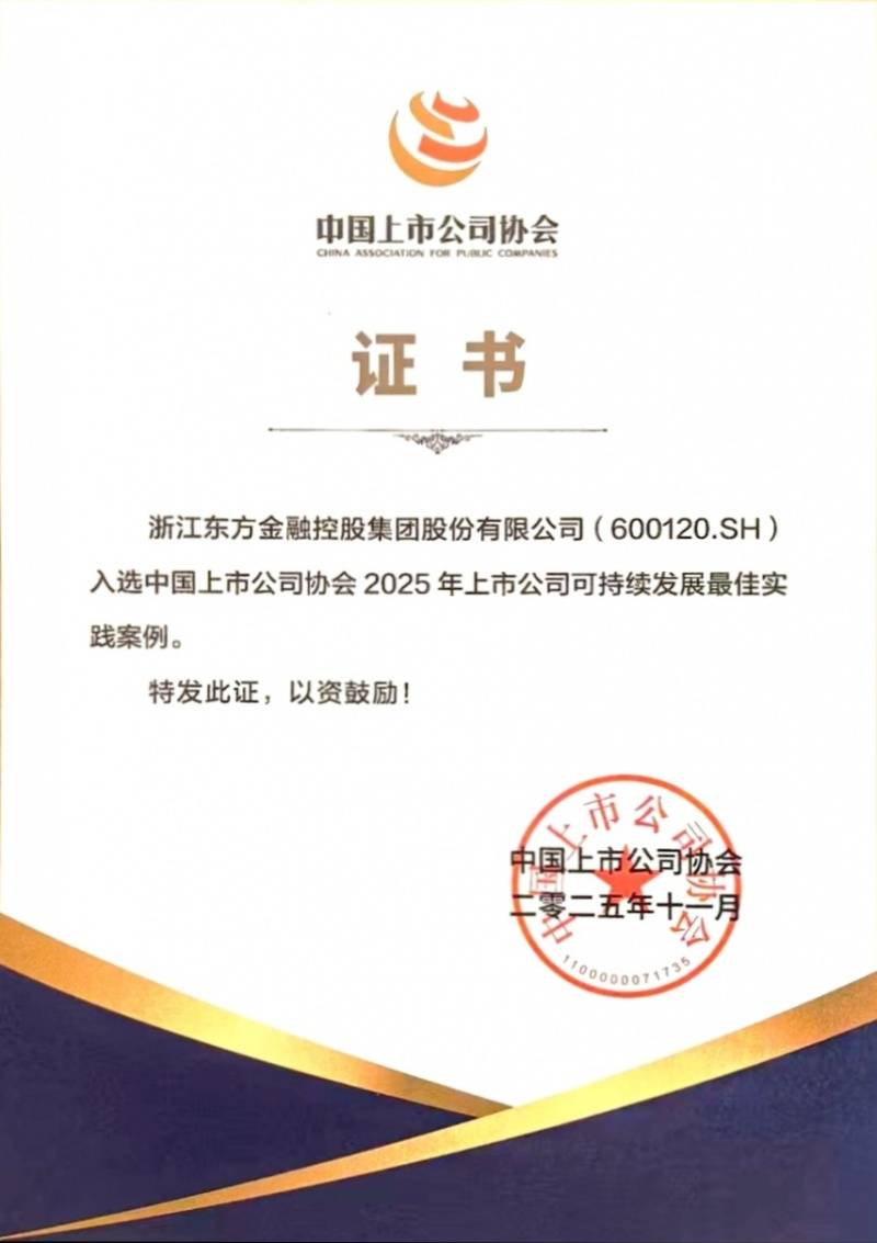 浙江東方再次榮獲“2025年上市公司可持續(xù)發(fā)展最佳實踐案例”“優(yōu)秀上市公司獎”“最具社會責(zé)任上市公司獎”“2025浙江省企業(yè)社會責(zé)任報告優(yōu)秀案例”等多項獎項。